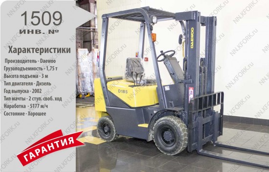Дизельный автопогрузчик Daewoo Б/У с интентарным номером 1509 2002 года выпуска. Состояние - Хорошее. Имеет грузоподъемность 1750 кг. Гарантия: 1 мес или 200 м/час.