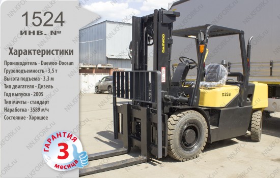 Дизельный автопогрузчик Daewoo-doosan Б/У с интентарным номером 1524 2005 года выпуска. Состояние - Хорошее. Имеет грузоподъемность 3500 кг. Гарантия: 3 мес или 500 м/час.