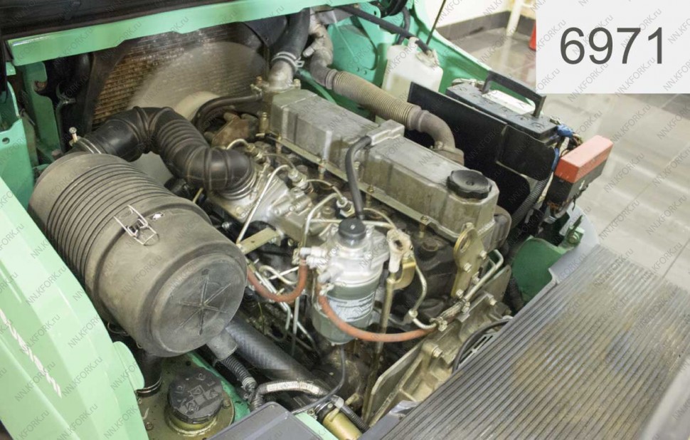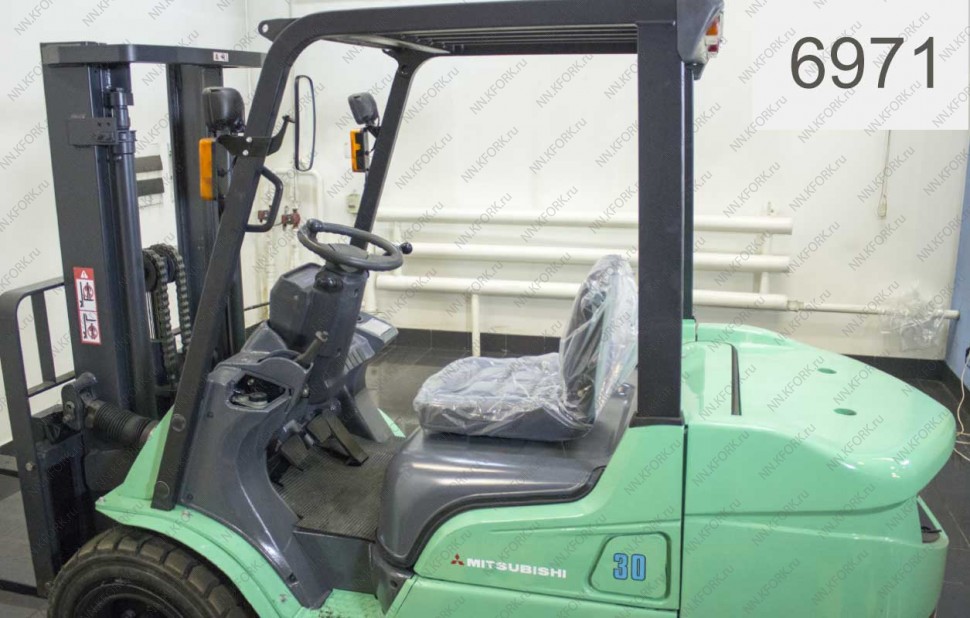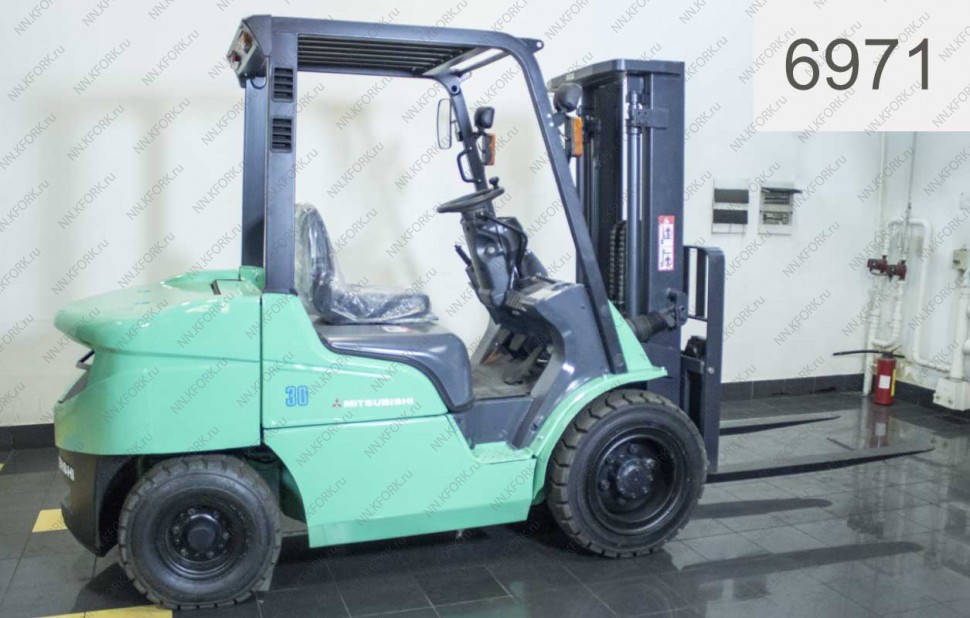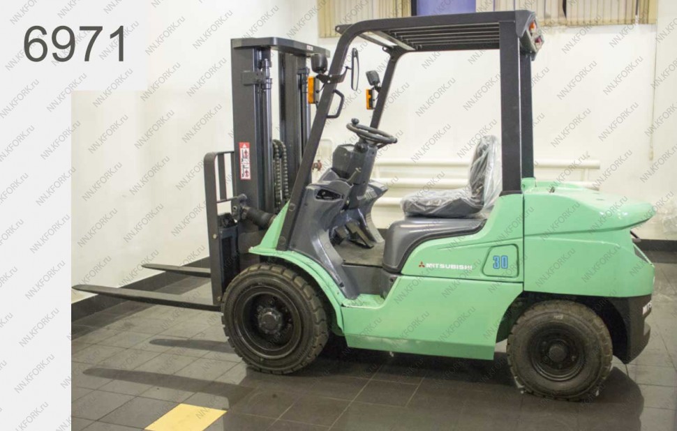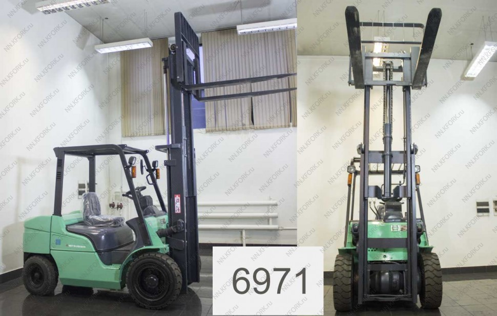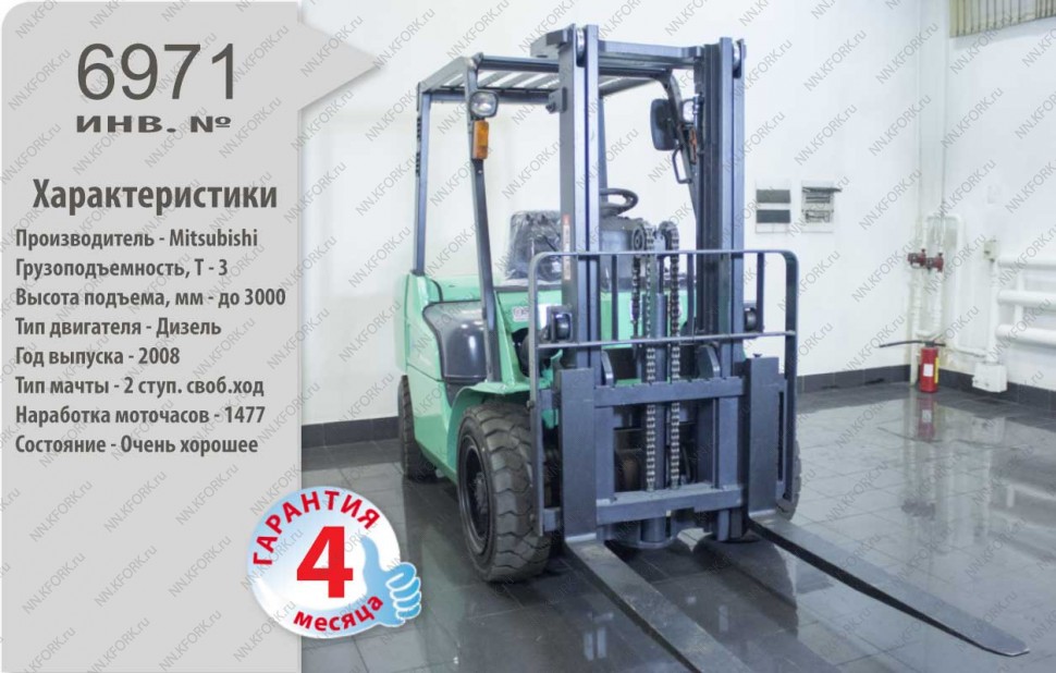 Дизельный автопогрузчик Mitsubishi Б/У с интентарным номером 6971 2008 года выпуска. Состояние - Хорошее. Имеет грузоподъемность 3000 кг. Гарантия: 4 мес или 500 м/час.