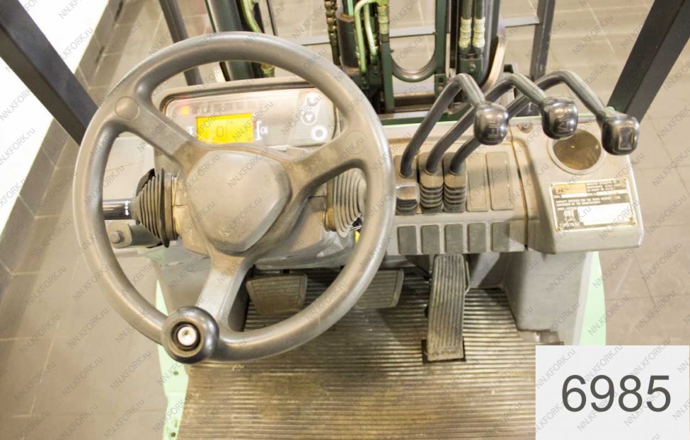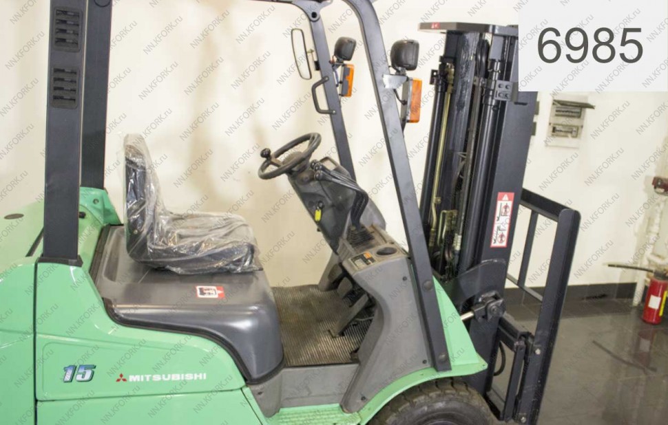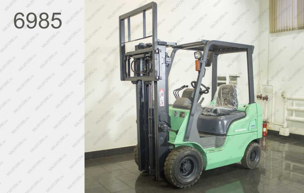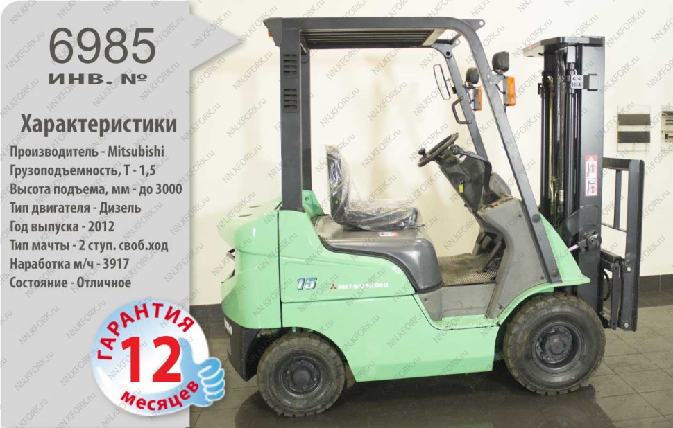 Дизельный автопогрузчик Mitsubishi Б/У с интентарным номером 6985 2012 года выпуска. Состояние - Отличное. Имеет грузоподъемность 1500 кг. Гарантия: 1 год или 1000 м/час.