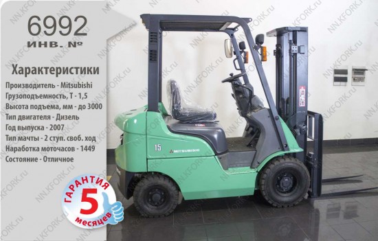 Дизельный автопогрузчик Mitsubishi Б/У с интентарным номером 6992 2007 года выпуска. Состояние - Отличное. Имеет грузоподъемность 1500 кг. Гарантия: 6 мес или 800 м/час.