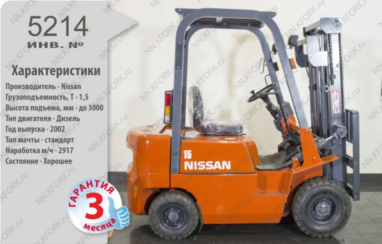 Дизельный автопогрузчик Nissan Б/У с интентарным номером 5214 2002 года выпуска. Состояние - Хорошее. Имеет грузоподъемность 1500 кг. Гарантия: 3 мес или 500 м/час.
