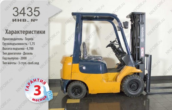 Дизельный автопогрузчик Toyota Б/У с интентарным номером 3435 2000 года выпуска. Состояние - Хорошее. Имеет грузоподъемность 1750 кг. Гарантия: 2 мес или 300 м/час.