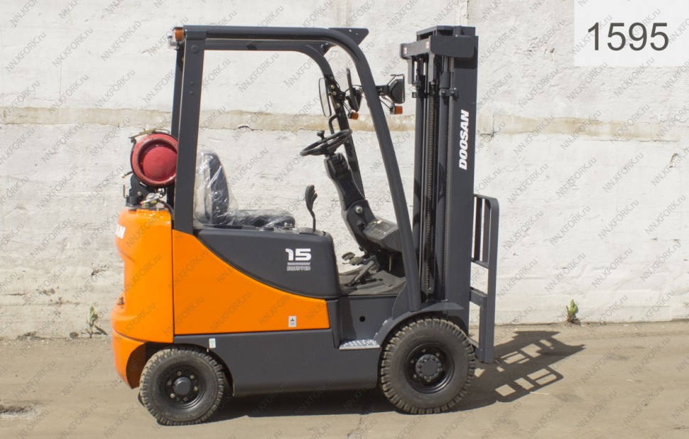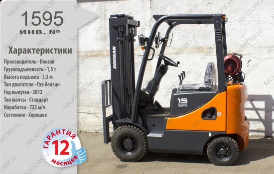 Газ-Бензиновый автопогрузчик Doosan Б/У с интентарным номером 1595 2012 года выпуска. Состояние - Хорошее. Имеет грузоподъемность 1500 кг. Гарантия: 1 год или 1000 м/час.