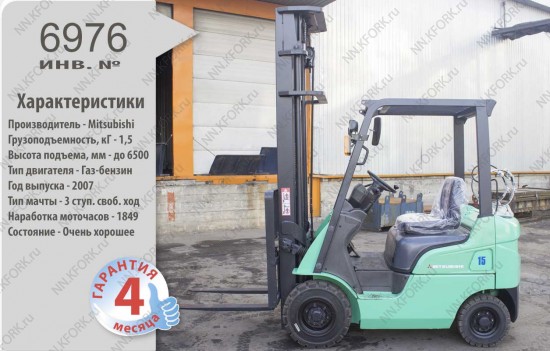 Газ-Бензиновый автопогрузчик Mitsubishi Б/У с интентарным номером 6976 2007 года выпуска. Состояние - Хорошее. Имеет грузоподъемность 1500 кг. Гарантия: 4 мес или 500 м/час.