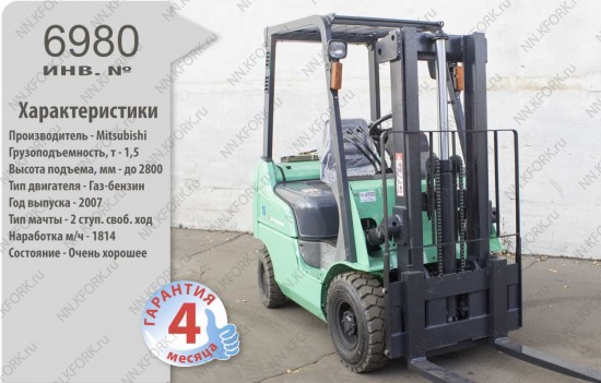 Газ-Бензиновый автопогрузчик Mitsubishi Б/У с интентарным номером 6980 2007 года выпуска. Состояние - Хорошее. Имеет грузоподъемность 1500 кг. Гарантия: 4 мес или 500 м/час.