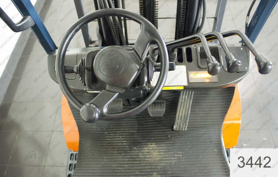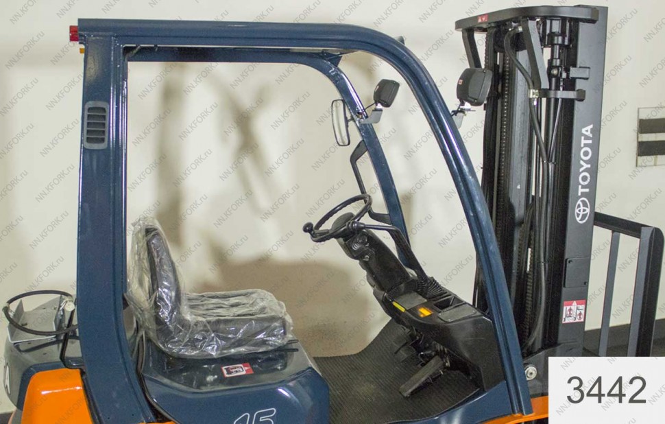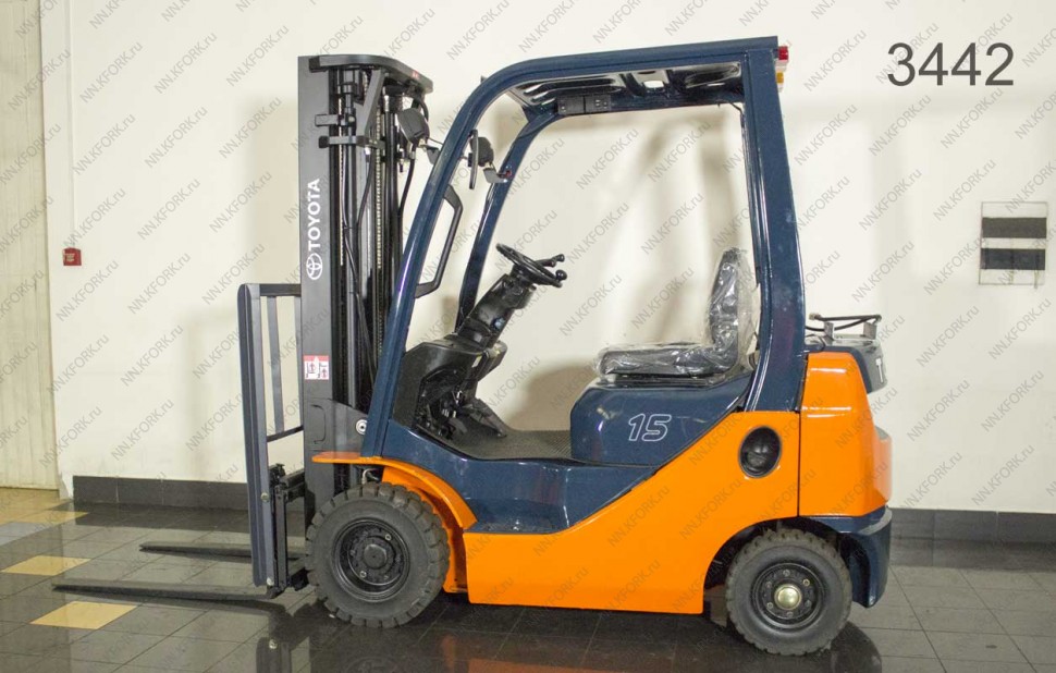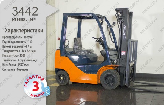 Газ-Бензиновый автопогрузчик Toyota Б/У с интентарным номером 3442 2006 года выпуска. Состояние - Хорошее. Имеет грузоподъемность 1500 кг. Гарантия: 3 мес или 500 м/час.
