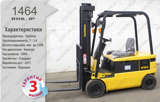 Электрический погрузчик Daewoo Б/У с интентарным номером 1464 2004 года выпуска. Состояние - Хорошее. Имеет грузоподъемность 1600 кг. Гарантия: 3 мес или 500 м/час.