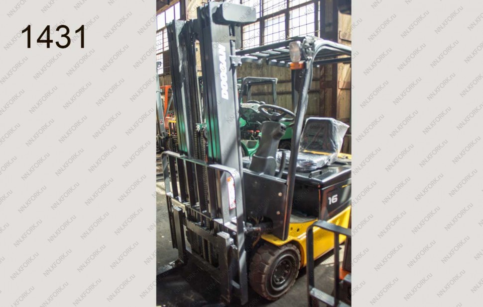 Электрический погрузчик Doosan Б/У с интентарным номером 1431 2007 года выпуска. Состояние - Хорошее. Имеет грузоподъемность 1600 кг. Гарантия: 4 мес или 500 м/час.