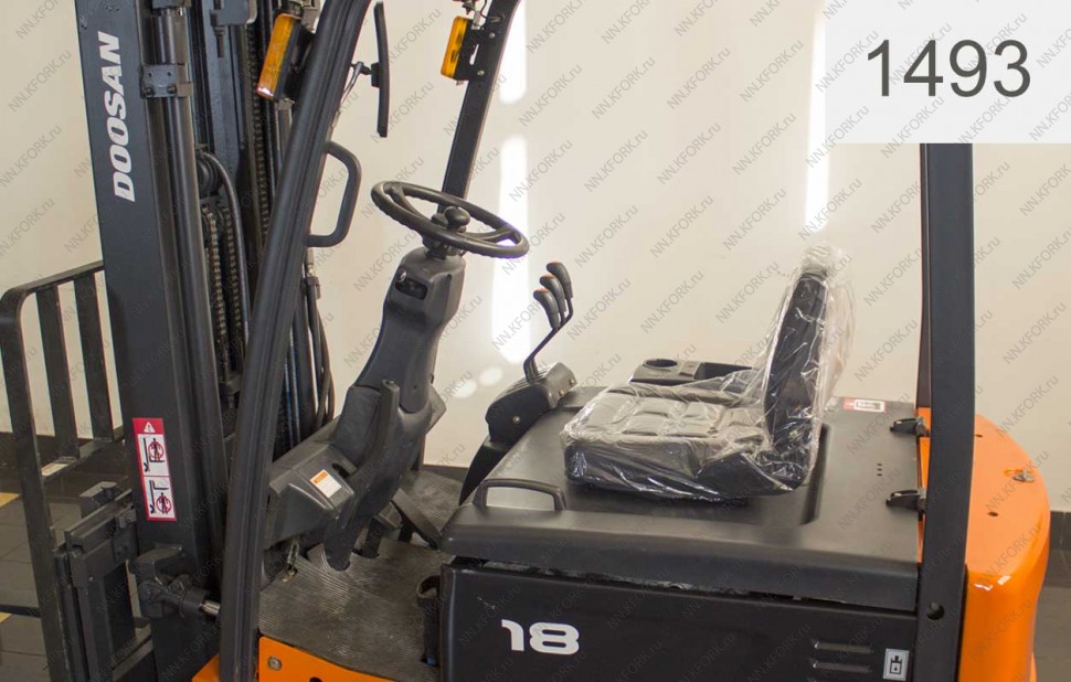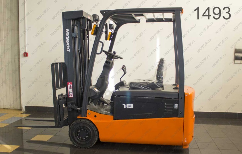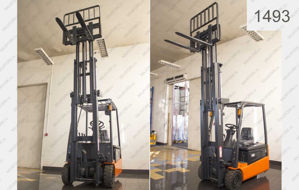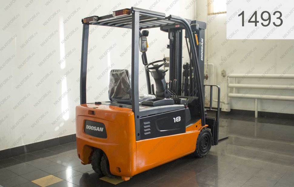 Электрический погрузчик Doosan Б/У с интентарным номером 1493 2012 года выпуска. Состояние - Хорошее. Имеет грузоподъемность 1750 кг. Гарантия: 3 мес или 500 м/час.