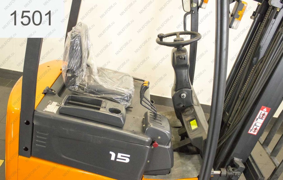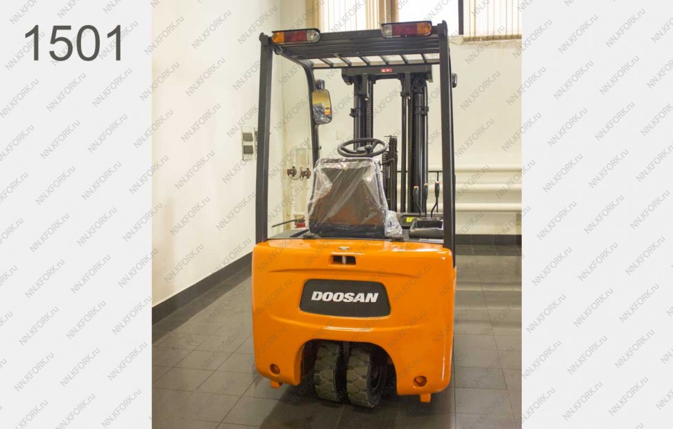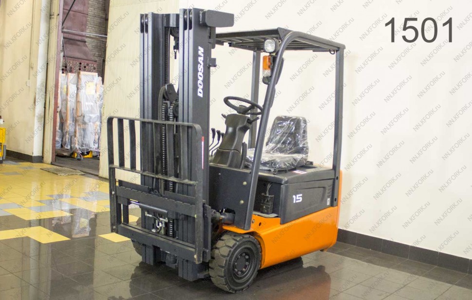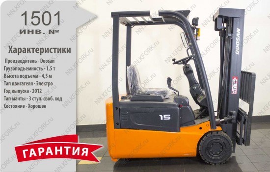 Электрический погрузчик Doosan Б/У с интентарным номером 1501 2012 года выпуска. Состояние - Хорошее. Имеет грузоподъемность 1500 кг. Гарантия: 1 мес или 200 м/час.