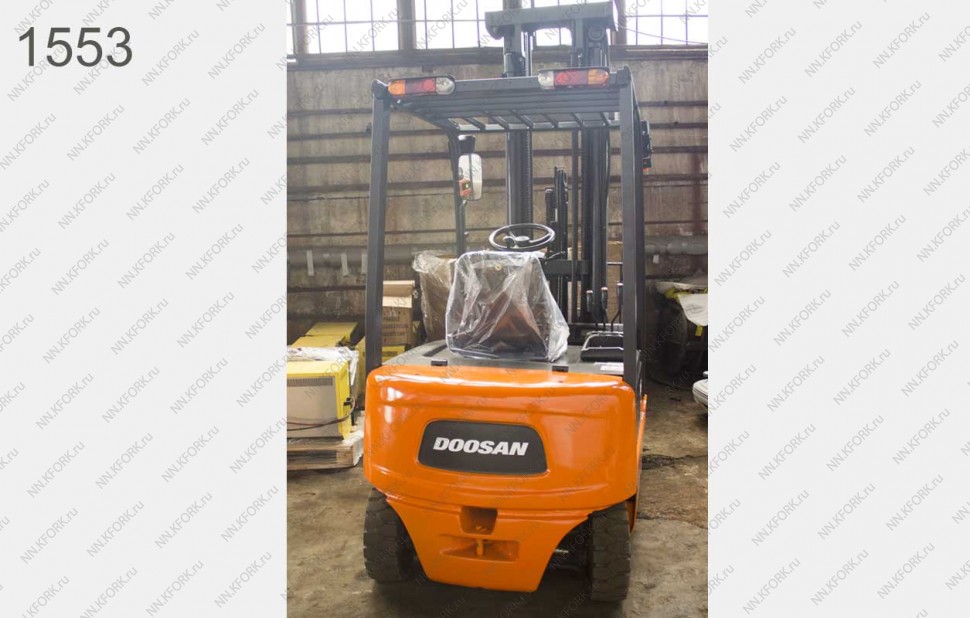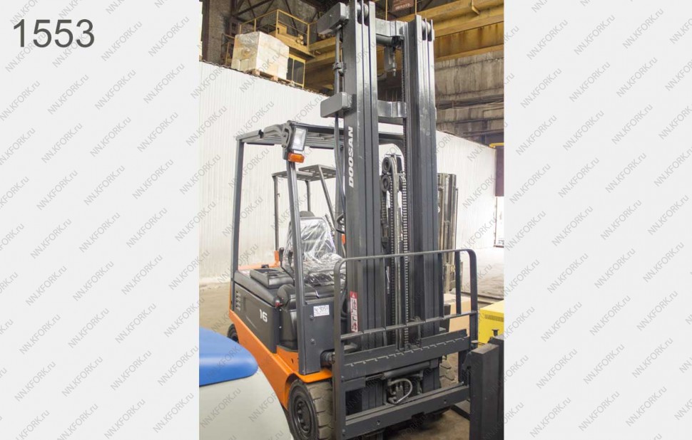 Электрический погрузчик Doosan Б/У с интентарным номером 1553 2012 года выпуска. Состояние - Хорошее. Имеет грузоподъемность 1600 кг. Гарантия: 1 мес или 200 м/час.