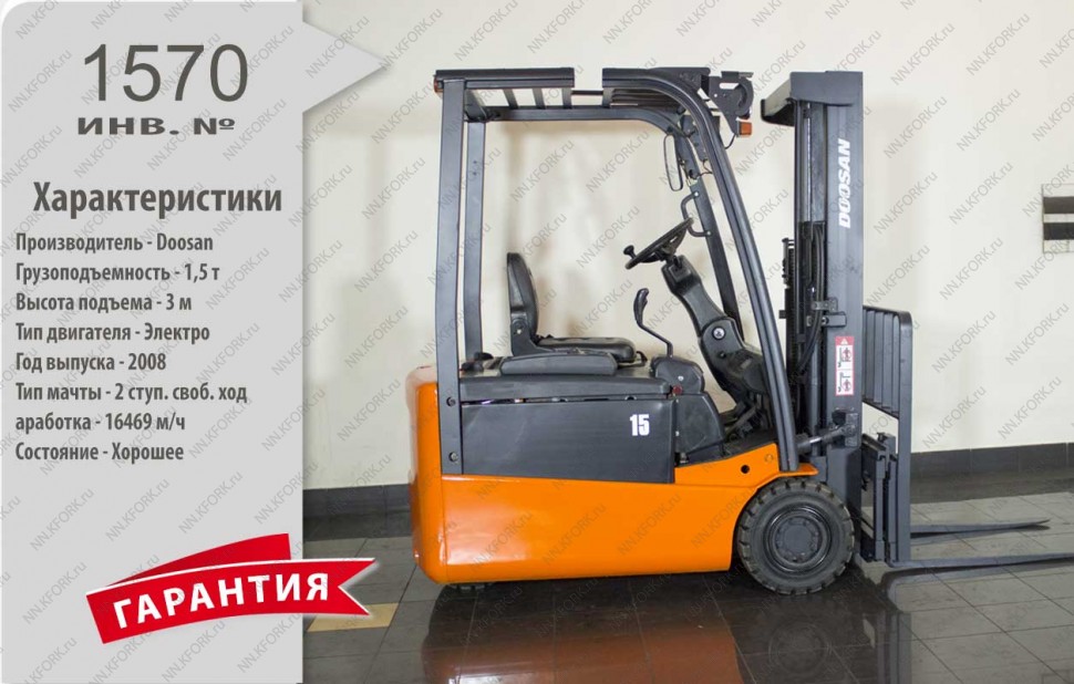 Электрический погрузчик Doosan Б/У с интентарным номером 1570 2008 года выпуска. Состояние - Хорошее. Имеет грузоподъемность 1500 кг. Гарантия: 1 мес или 200 м/час.