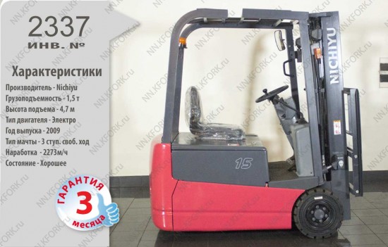 Электрический погрузчик Nichiyu Б/У с интентарным номером 2337 2009 года выпуска. Состояние - Хорошее. Имеет грузоподъемность 1500 кг. Гарантия: 3 мес или 500 м/час.
