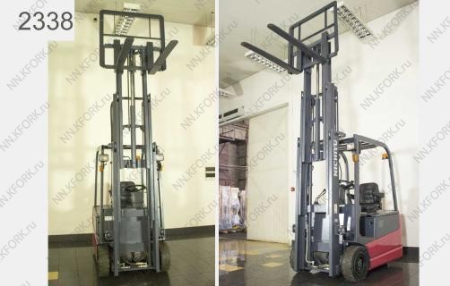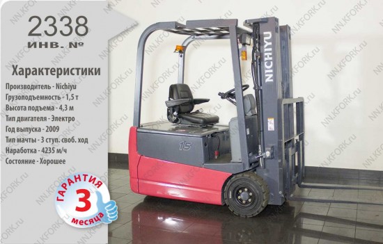 Электрический погрузчик Nichiyu Б/У с интентарным номером 2338 2009 года выпуска. Состояние - Хорошее. Имеет грузоподъемность 1500 кг. Гарантия: 3 мес или 500 м/час.