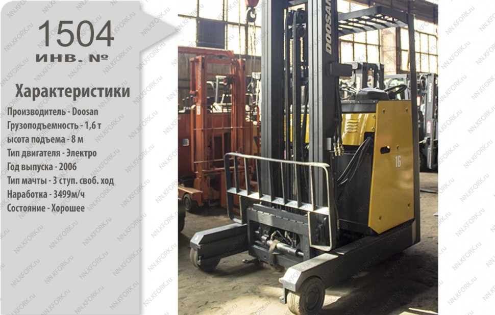 Электрический Ричтрак Doosan Б/У с интентарным номером 1504 2006 года выпуска. Состояние - Хорошее. Имеет грузоподъемность 1600 кг. Гарантия: 1 мес или 200 м/час.